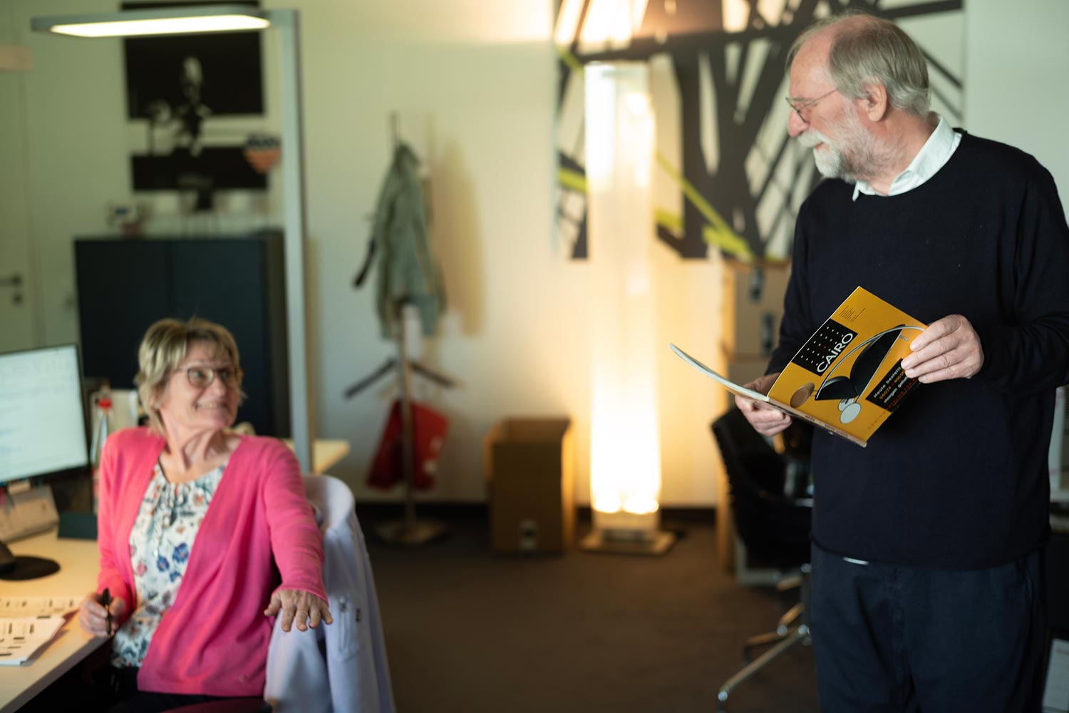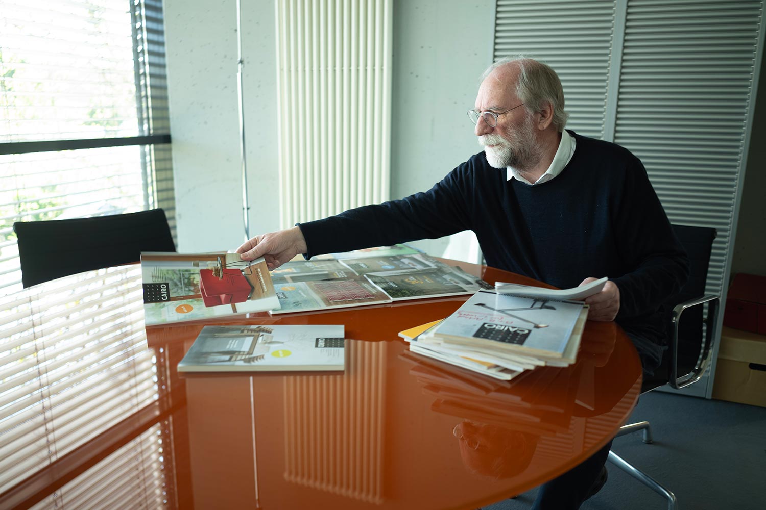(Gerhard Wolf greift den ersten Cairo Katalog, der vor dreißig Jahren entstanden ist)