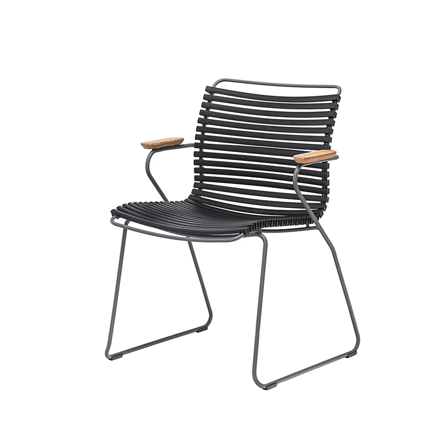 Geschmackvolle Zurückhaltung: Click ist eine Möbelserie für den Außenbereich, die aus verschiedenen Liege-, Ruhe- und Sitzmöbeln besteht. All diese Möbel sind Schöpfungen des skandinavischen Designers Henrik Pedersen. Die Möbel treten mit einer eindrucksvollen ästhetischen Harmonie auf, die aus dem reizvollen Zusammenspiel des zierlichen Gestells aus grauem pulverbeschichtetem Stahl und den filigranen Lamellen resultiert. Die Armlehnen bestehen aus Bambusholz – einem qualitätsvollen Werkstoff, der sich im europäischen Möbelbau einer steigenden Beliebtheit erfreut. Der hier gezeigte Armlehnstuhl bietet Ihnen wie auch alle anderen Möbel der Click-Serie funktionale Vollendung und genussvollen Komfort.