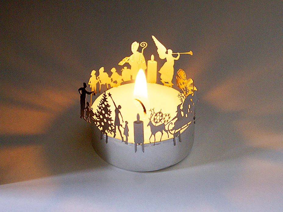 Mit den Teelicht-Aufsätzen Advent und Mini Krippe erwacht die Krippenszenerie im Kerzenschein zu neuem Leben. Vor der Flamme zeichnen sich die Silhouetten von adventlichen Schlitten, Kerzen und Rentieren ab. Die Schatten von Maria, Josef und dem Christuskind tanzen durch das flackernde Licht. Geschenke aus dem Morgenland werden von den Heiligen Drei Königen überbracht. Hirten und ein Engel sind ebenso vertreten wie ein Kamel, Ochs und Esel. Da sich die Figuren individuell anordnen lassen, können Sie Ihre eigene Szenerie kreieren. Die Silhouette aus hochveredeltem rostfreiem Federstahl kann immer wieder verwendet werden. Sie wird mit einem Teelicht, dem Projektionsschirm und einer Aufbauanleitung geliefert. Die Adventsmotive und die Krippe können auch ohne Teelicht aufgebaut werden, indem die einzelnen Figuren einfach in ein Stück Moos, Holz oder eine Orangenschale gesteckt werden. Jede Figur ist an der Unterseite mit einem speziellen Pin versehen, sodass sie überall dort aufgestellt werden kann, wo Sie es wollen.