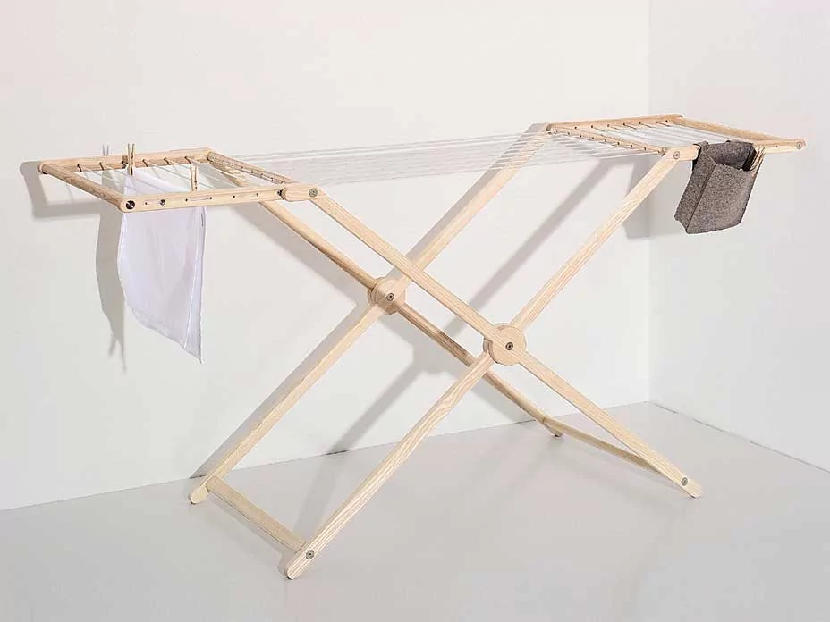 Ein Wäscheständer fürs Wohnzimmer – könnte man meinen. Der Wäscheständer Mama präsentiert sich in elegantem Design und hochwertigem Material. Das Gestell aus massiver Esche ist unbehandelt, die Kunststoffleine verstärkt. Mama wird komplett montiert geliefert und ist sofort einsetzbar.