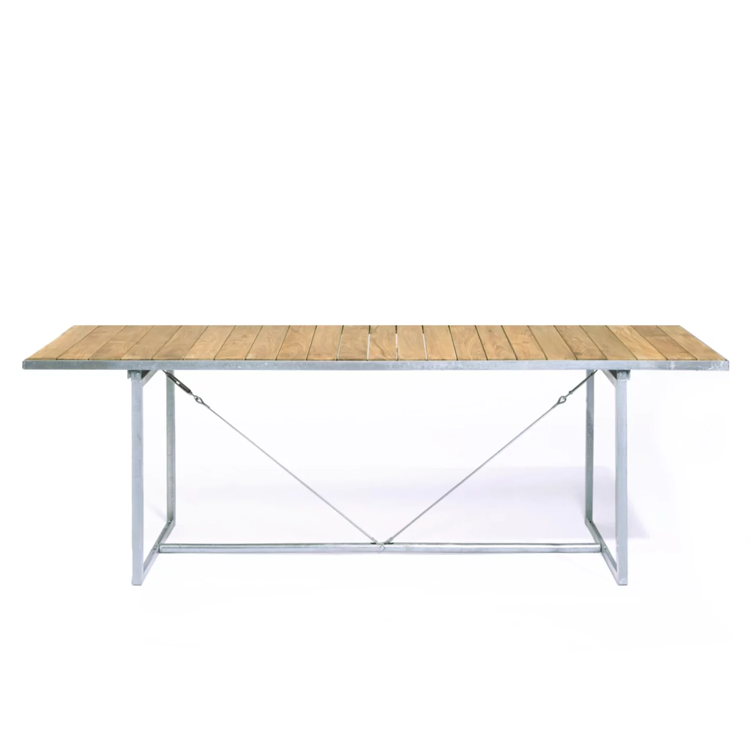 Die Gartentisch Jever von Jan Kurtz besticht qualitativ und ästhetisch durch die gelungene Kombination von Stahl und Teakholz. Teak ist schön, fest und außergewöhnlich hart – deshalb eignet es sich gut für den Möbelbau. Das Teakholz der Tischplatte wartet mit einer glatten Oberfläche und einem hellem Farbton auf, der mit dem Stahl des Gestells wunderbar harmoniert. Der Gartentisch Jever ist am Boden sowohl durch ein zusätzliches Rundrohr als auch durch davon ausgehende Spannseile stabilisiert. Diese Konstruktionsweise sowie die anmutige Materialkombination aus Holz und Stahl verleihen dem Tisch Jever von Jan Kurtz eine elegant-industrielle Aura.