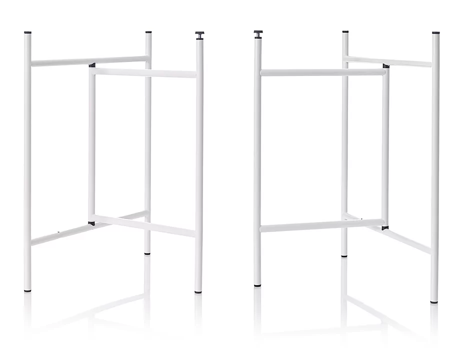 Inspiriert vom Tischgestell Egon Eiermanns aus dem Jahr 1953 hatte der Designer Alexander Seifried 2014 die Idee zu einem neuen Gestell dem Klappbock Eiermann 3. Mit großem Respekt vor dem Erfindungsreichtum des Architekten Eiermann nahm Seifried die originalen Seitenrahmen des Tischgestells und ergänzte diese mit langen Auslegern, die mittig oder exzentrisch montiert werden können – je nachdem, ob Sie den Tisch von ein oder zwei Seiten nutzen und die Beinfreiheit entsprechend verteilen wollen.