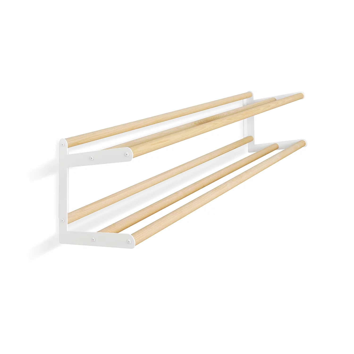 Stixx ist ein Schuhregal, das die Bodenhaftung verloren hat – mit dem großen Vorteil: unter den beiden Ebenen mit je einem Meter Nutzlänge bleibt zusätzlicher Stauraum. Mittels Wandmontage schmiegt sich Stixx luftig und leicht an jede Wand. Die Stäbe aus freundlich hellem Eschenholz, kombiniert mit schlanken Metallhalterungen, machen Stixx zu einem edlen Schuhregal voller Schwung und Leichtigkeit.